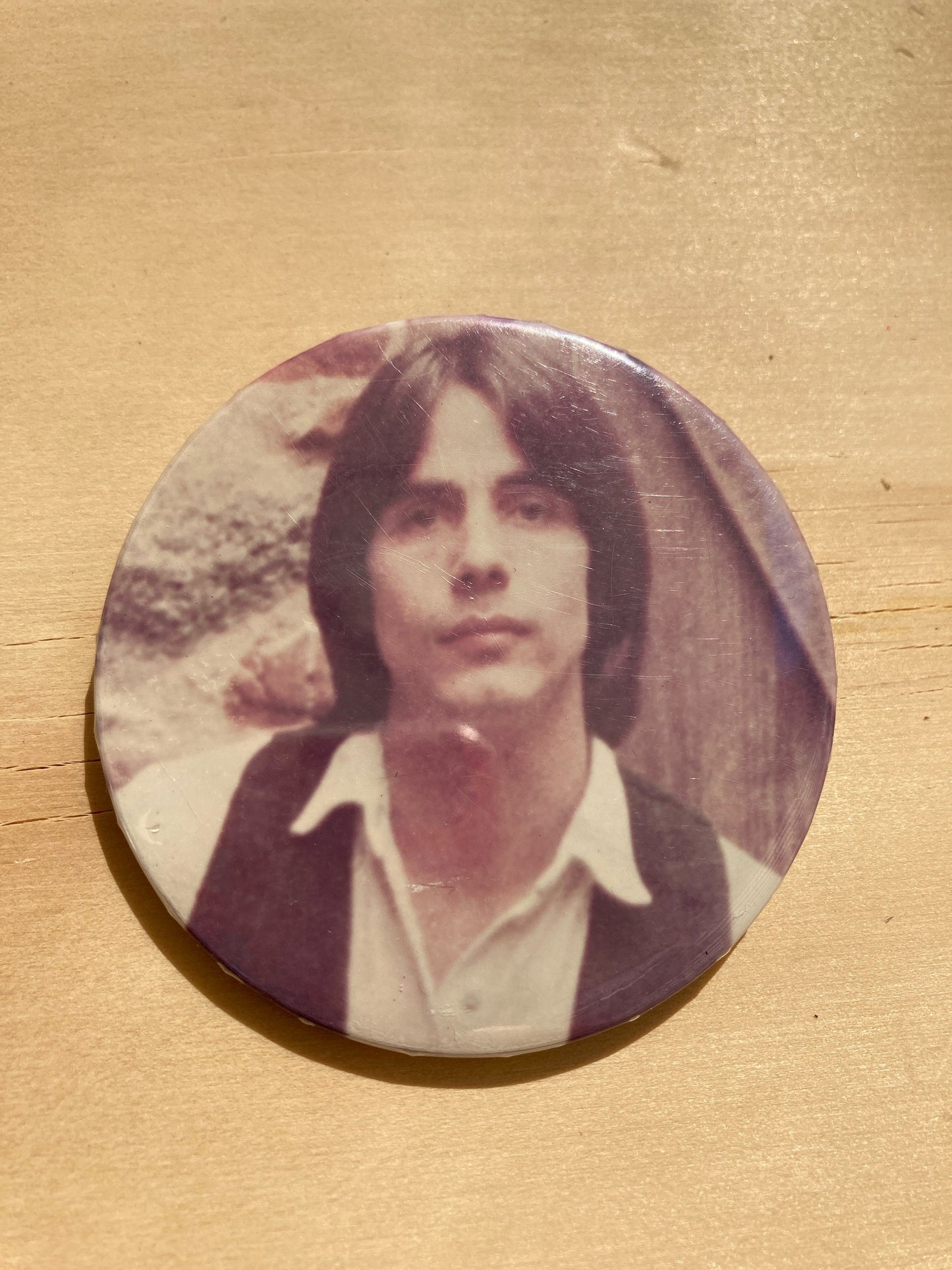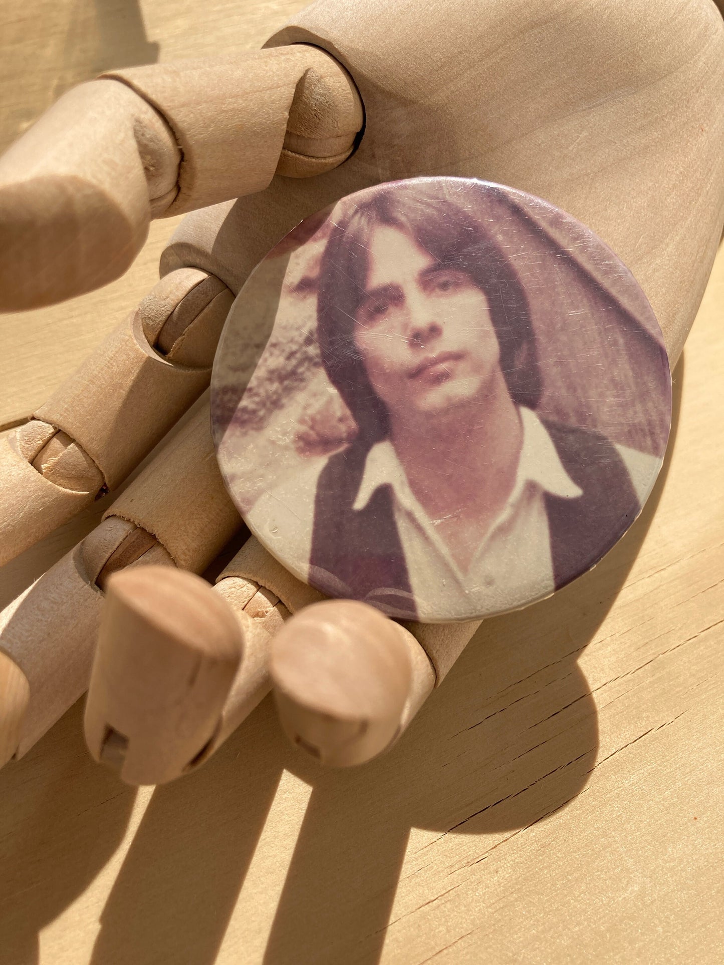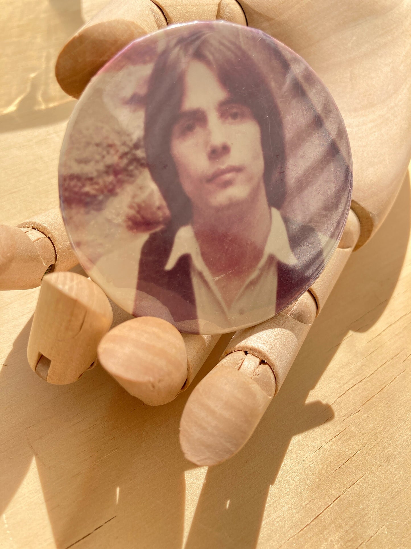 A great small gift for a lover of classic rock. This pin features a young Jackson Browne. A sepia tone portrait of the musician.