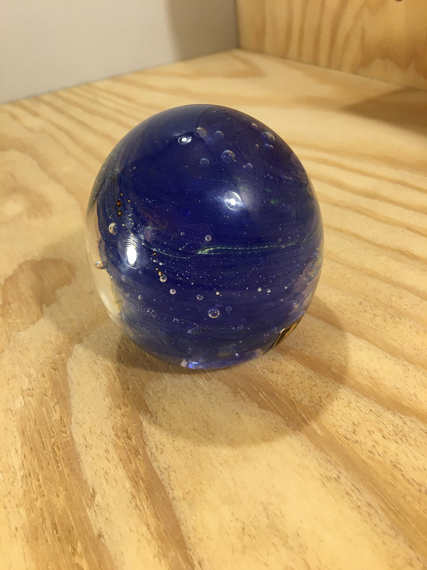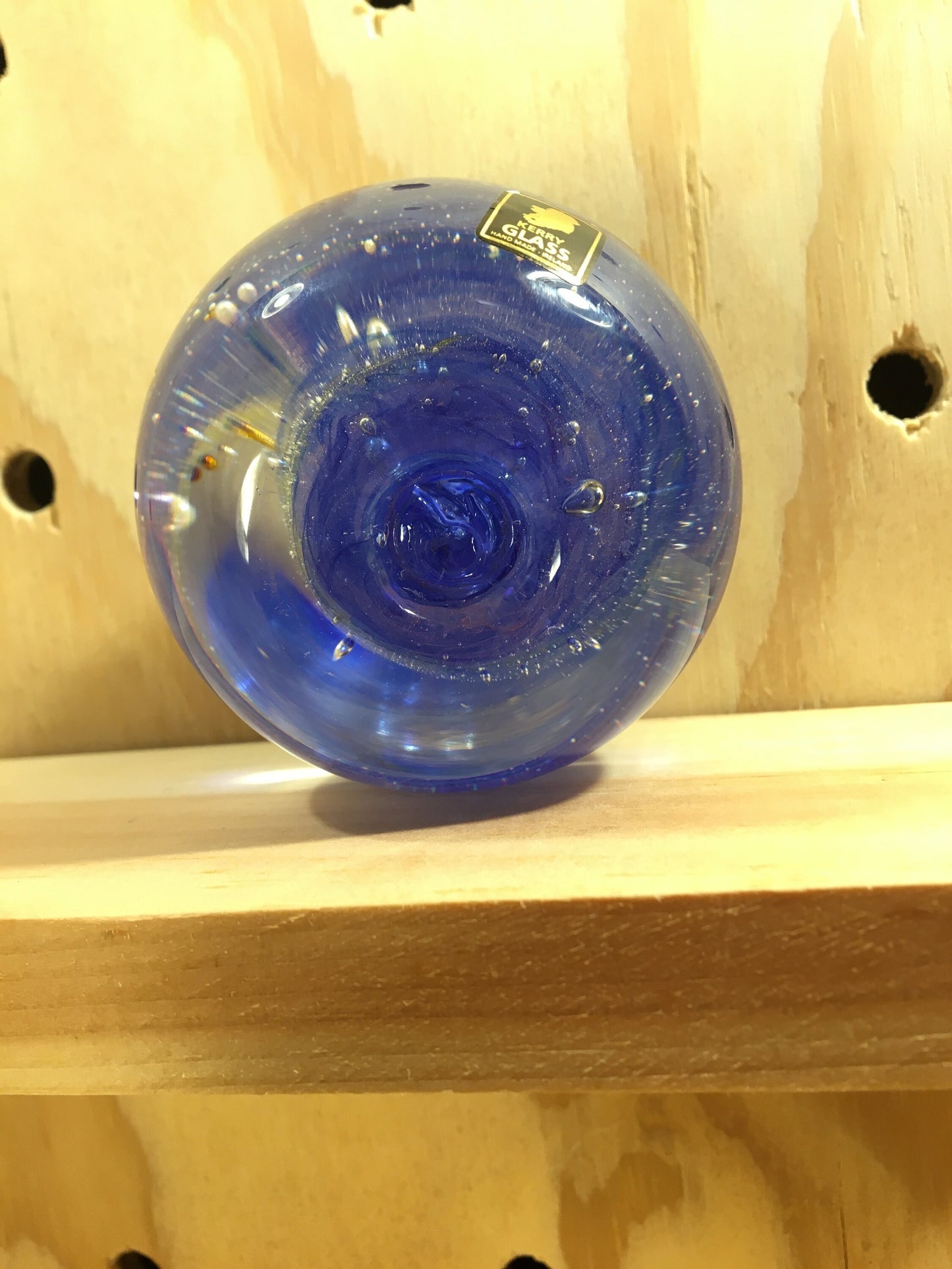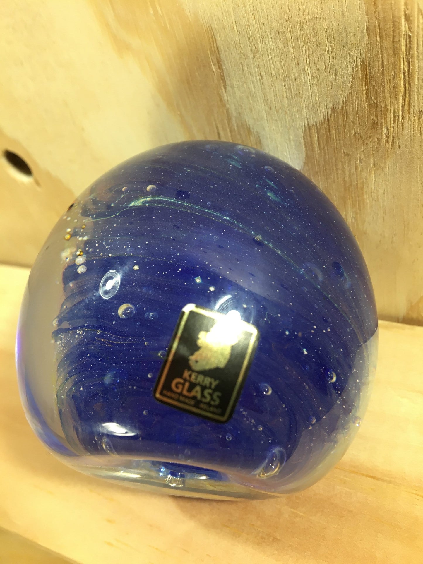 This beautiful, celestial, blue glass paperweight resembles the galaxy. Handblown in Ireland by Kerry Glass.