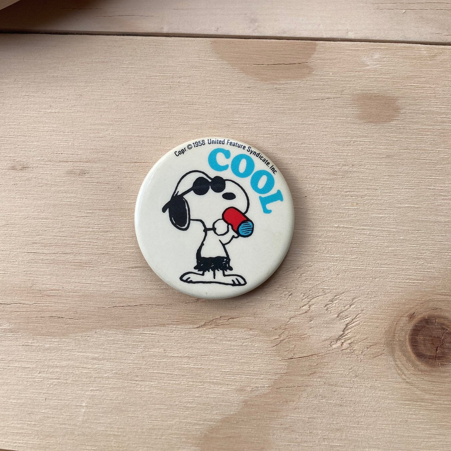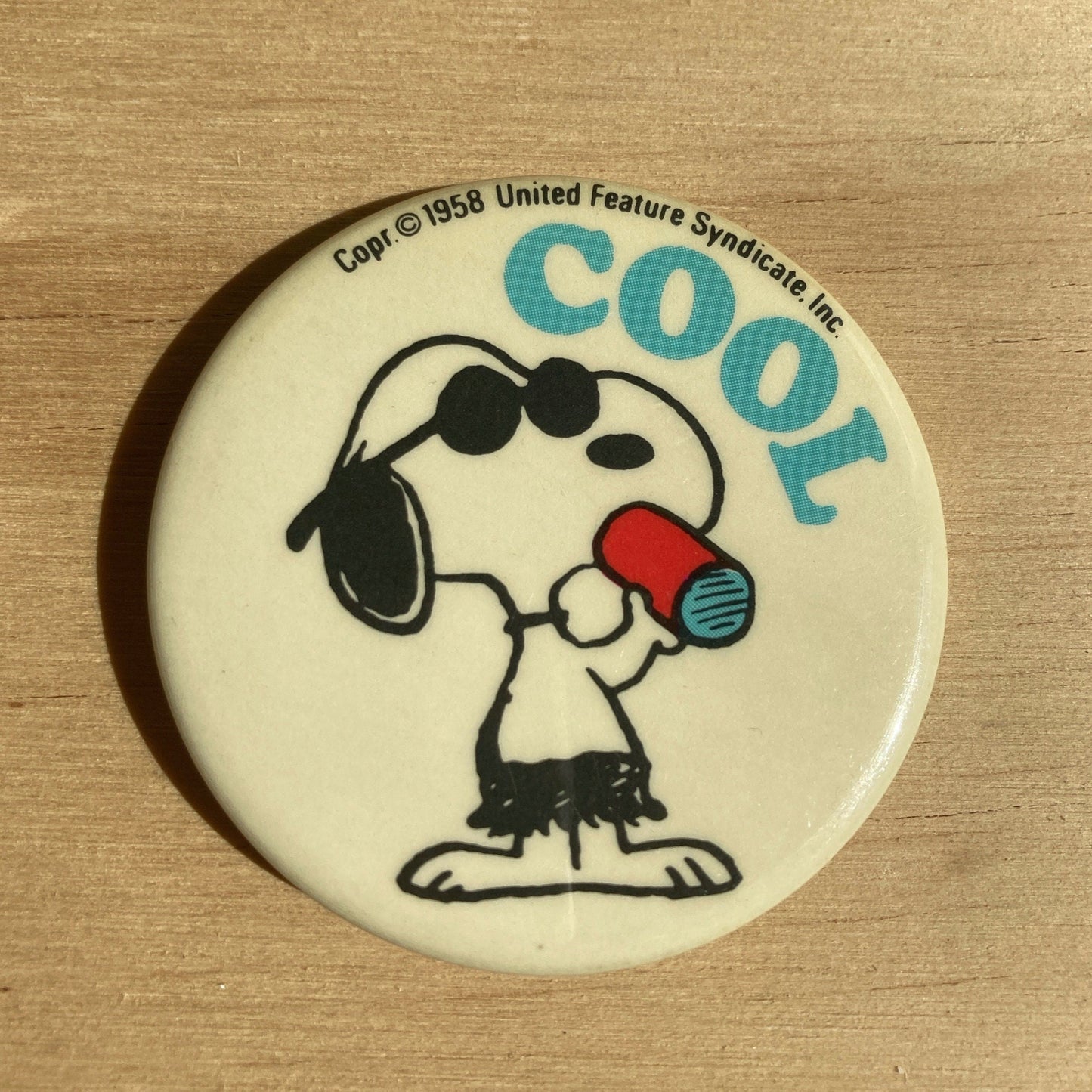 This novelty pin back button made in 1958 features beloved Snoopy as Joe Cool and depicts him sipping a red and blue can wearing sunglasses and reads “cool” in an aqua blue color.
