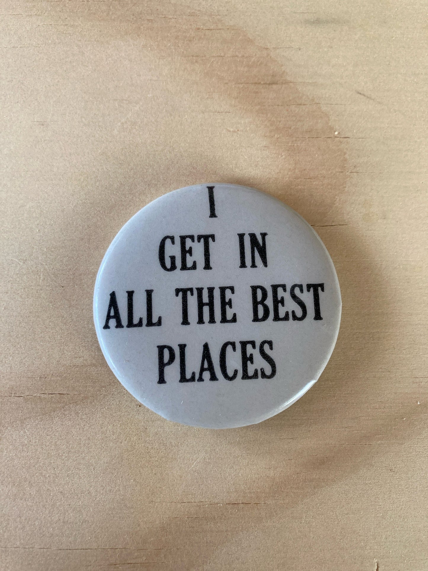 This novelty pin back button is grey with black font reads “I Get In All The Best Places”
