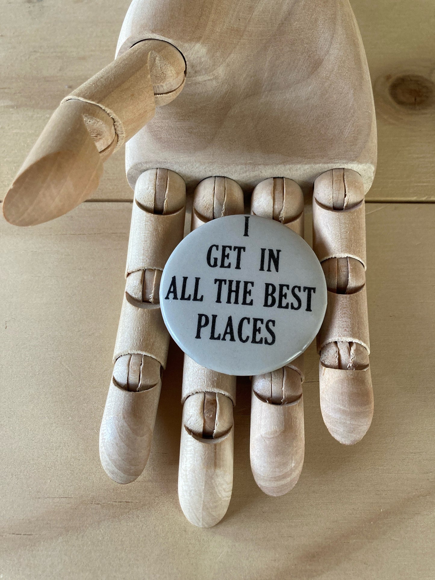 Vintage Pin Back Button - Novelty Accessories - 1980’s - I Get In All The Best Places Pin - Retro Style - 1.75” - Gift Idea - Made in USA